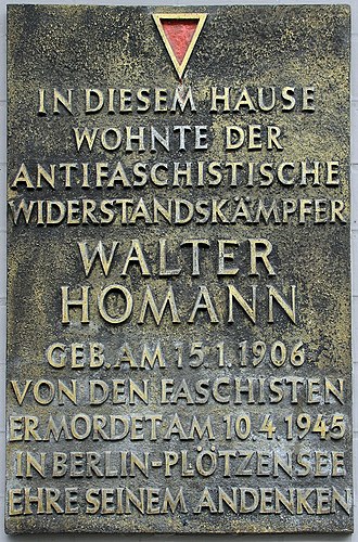 Walter Homann, born on January 15, 1906, in Berlin and executed on April 10, 1945, at Berlin-Plötzensee, was a German resistance fighter and a member of the anti-fascist network later known as the Red Orchestra. He worked as a locksmith at the AEG turbine factory in Berlin-Moabit. |