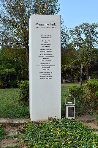 Marianne Fritz (December 14, 1948 – October 1, 2007) was an Austrian writer and novelist known for her ambitious work exploring the history of Austria in the twentieth century. Her debut novel Die Schwerkraft der Verhältnisse (The Weight of Things) won the Robert Walser Prize in 1978. |